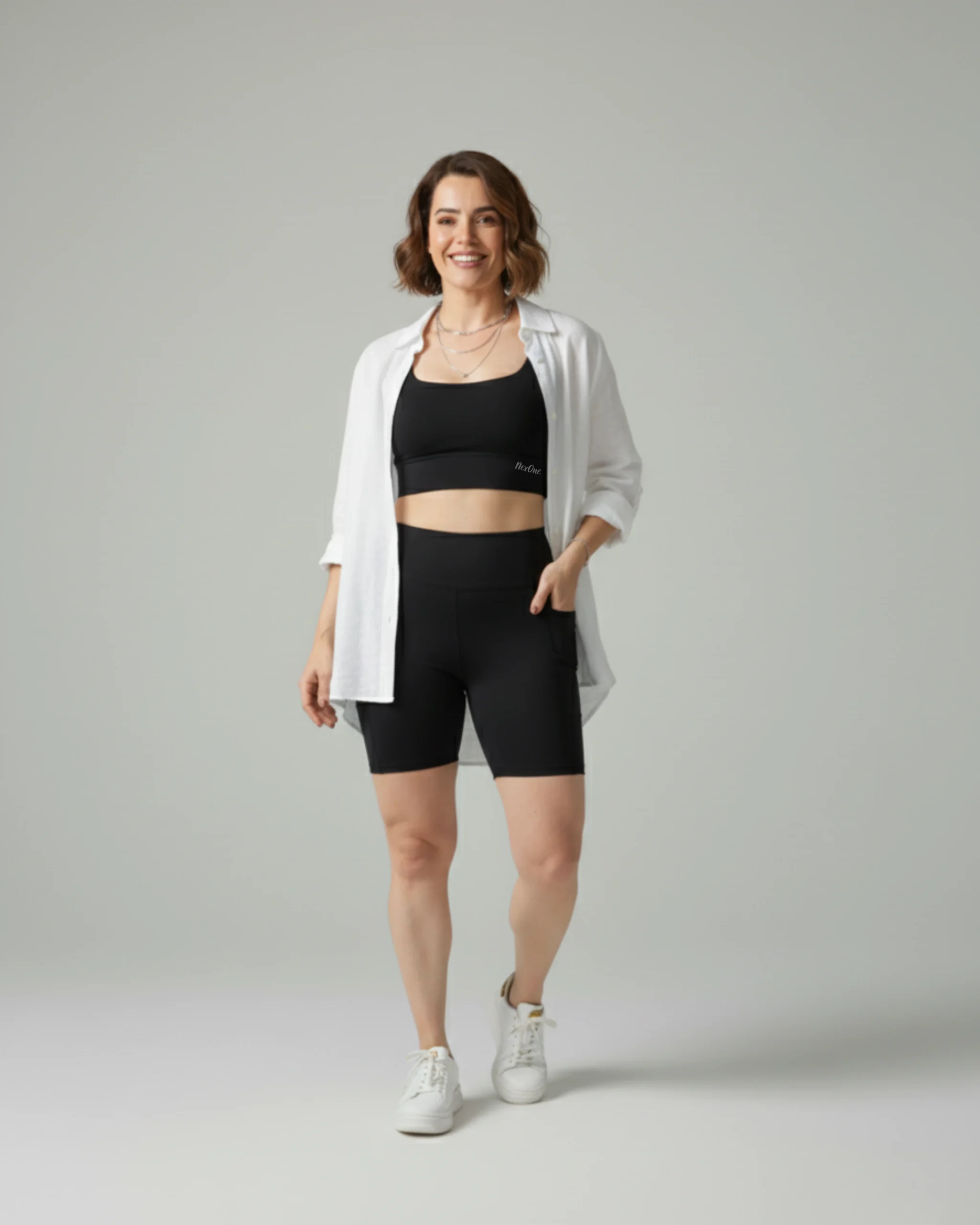 Bermuda com Bolso NexOne – PretoLiberdade para ir além. A Bermuda NexOne foi pensada para quem busca mobilidade, praticidade e proteção em uma só peça. Com comprimento abaixo dos joelhos e bolso lateral funcional, ela se adapta com facilidade aos treinos e à rotina urbana com estilo esportivo e sofisticado.Confeccionada em tecido tecnológico com proteção UV 50+, sua composição em 84% poliamida e 16% elastano oferece alta elasticidade, toque macio e ajuste ao corpo com segurança e conforto.Destaques:Cor: PretoModelagem de cintura alta com compressão alta.Cós anatômico de média compressãoBolso lateral funcionalProteção solar UV 50+Tecido de alta respirabilidade e elasticidadeComposição:84% Poliamida, 16% ElastanoIndicado para:Corridas, treinos ao ar livre, caminhadas, Pilates ou composições esportivas e athleisure com foco em performance.