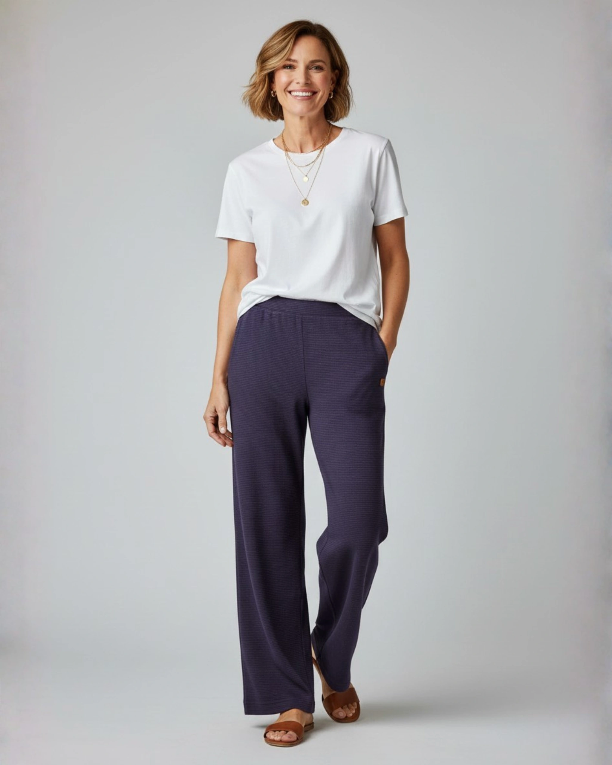 Pantalona em malha texturizada, leve e confortável.